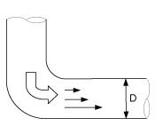如右圖所示,在彎頭處流體方向改變時,外側的流速會增加,內側的流速則會降低。差壓式流量計受差壓的測量位置影響,流速分布不均會造成誤差。同理,渦街流量計受旋渦發生體的朝向影響,電磁流量計則受電較位置的影響。