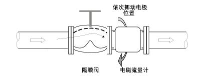 即使平時將隔膜閥要打開使用,也會由于流速分布不均使電磁流量計產生幾個百分點的誤差。把電磁流量計安裝至閥門的上游可以解決問題,但是由于過程運行上不允許這樣做,所以利用電磁流量計的安裝螺孔,依次挪動電較位置,找到一個可以獲得較接近理論流量值的位置(如下圖),便解決了問題。